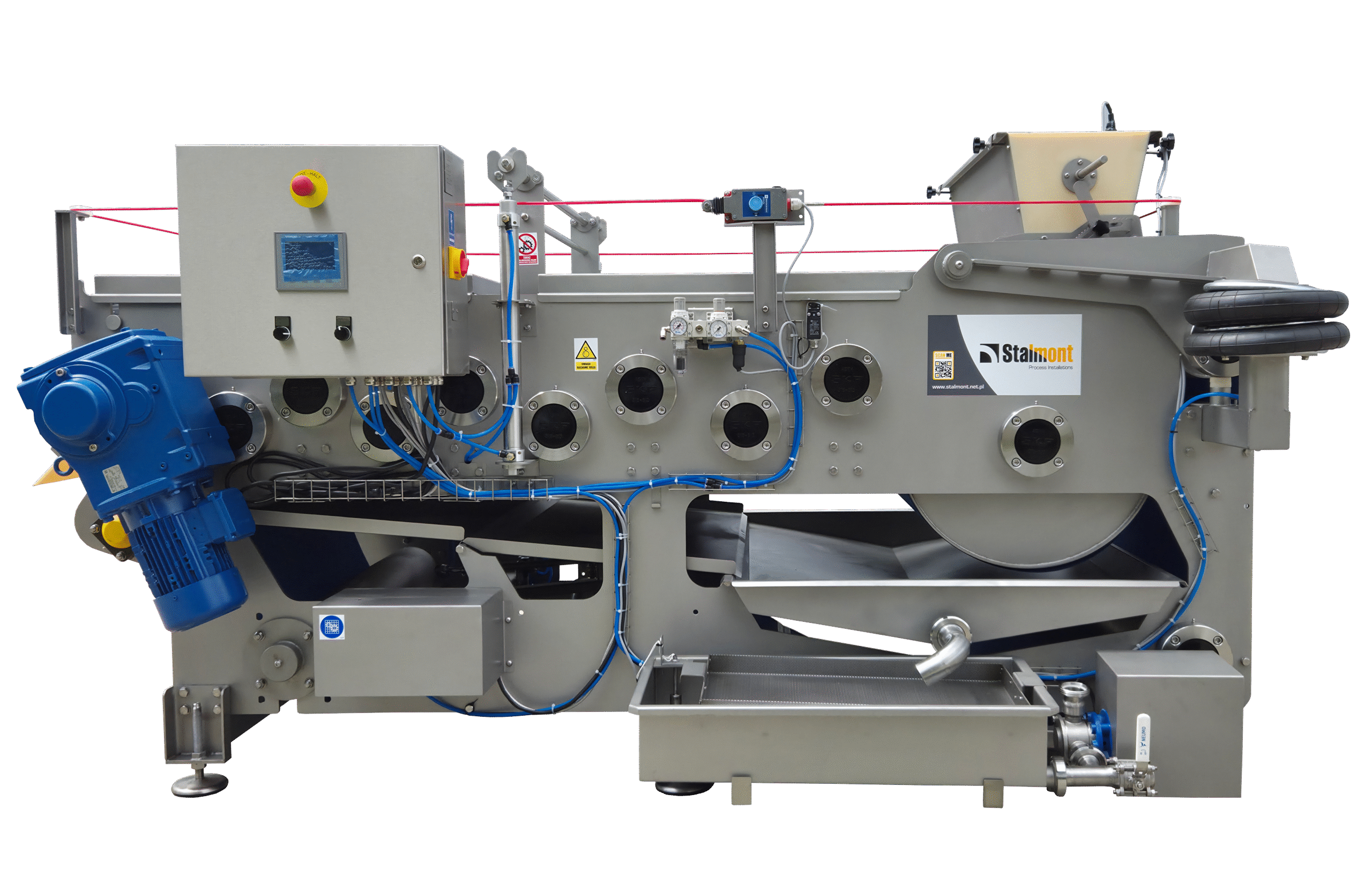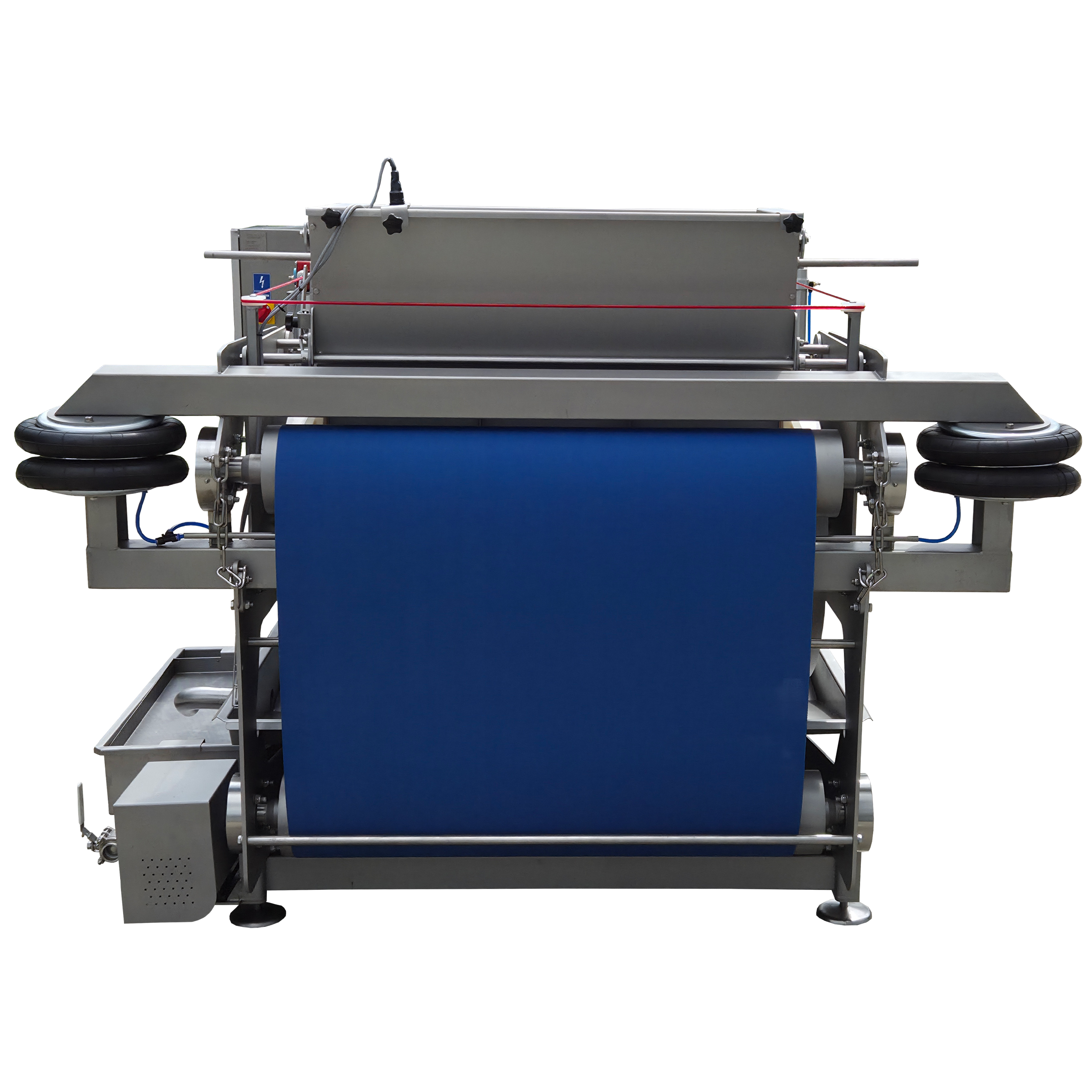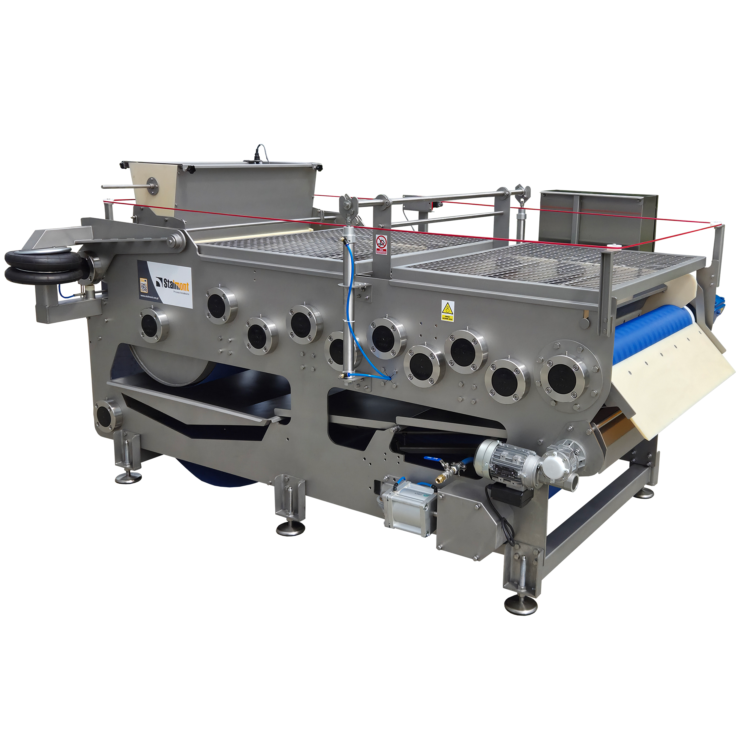 Rozdrobnione owoce są zgniatane pomiędzy taśmą polipropylenową, która przechodzi przez specjalne walce prasujące owoce. Po pierwszym wyciśnięciu prasowany materiał trafia poprzez wałem zwrotny do następnego (mniejszego) wałka prasy i ponownie poddawany jest prasowaniu. Taśma jest automatycznie naprężana poprzez siłowniki pneumatyczne.