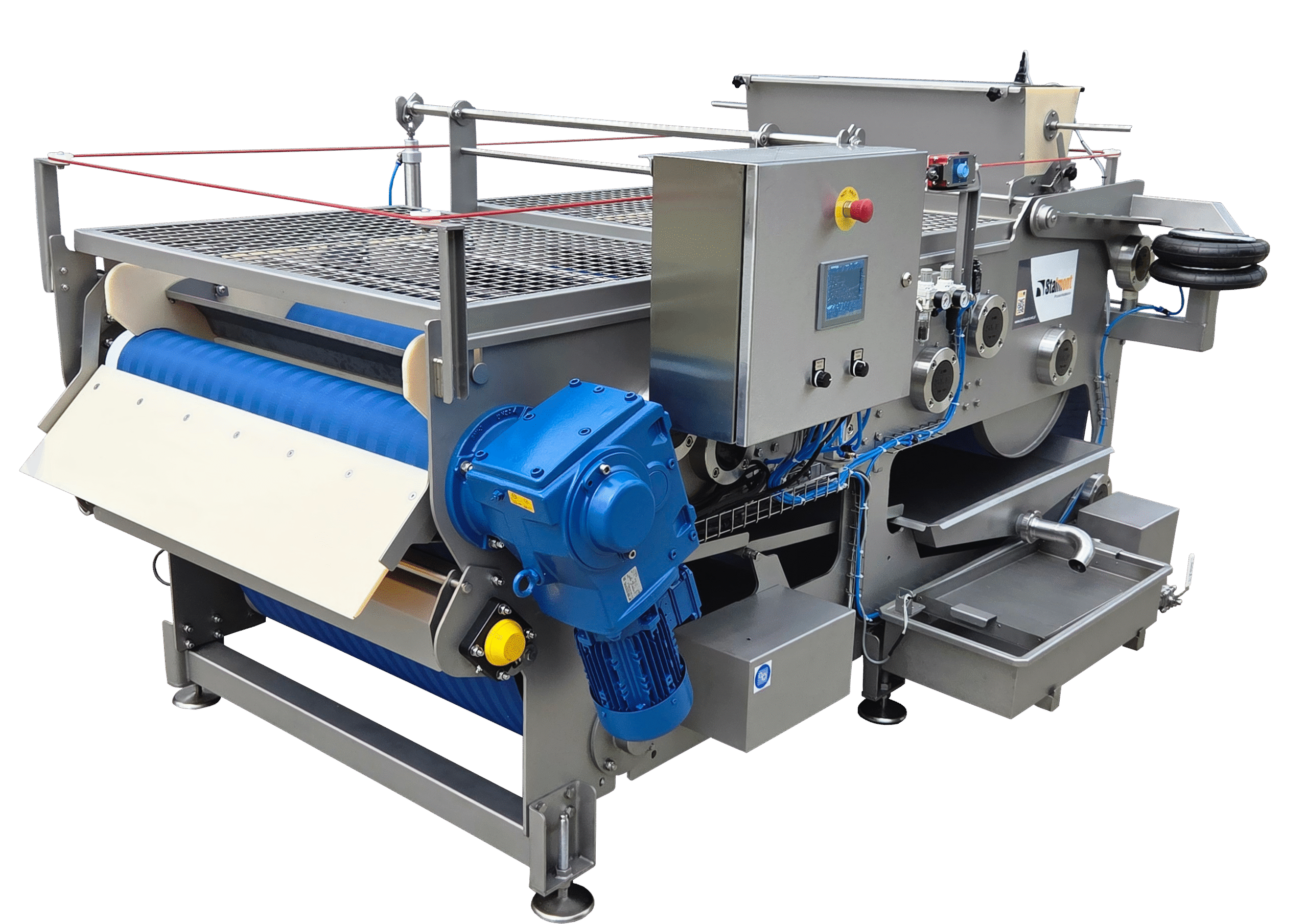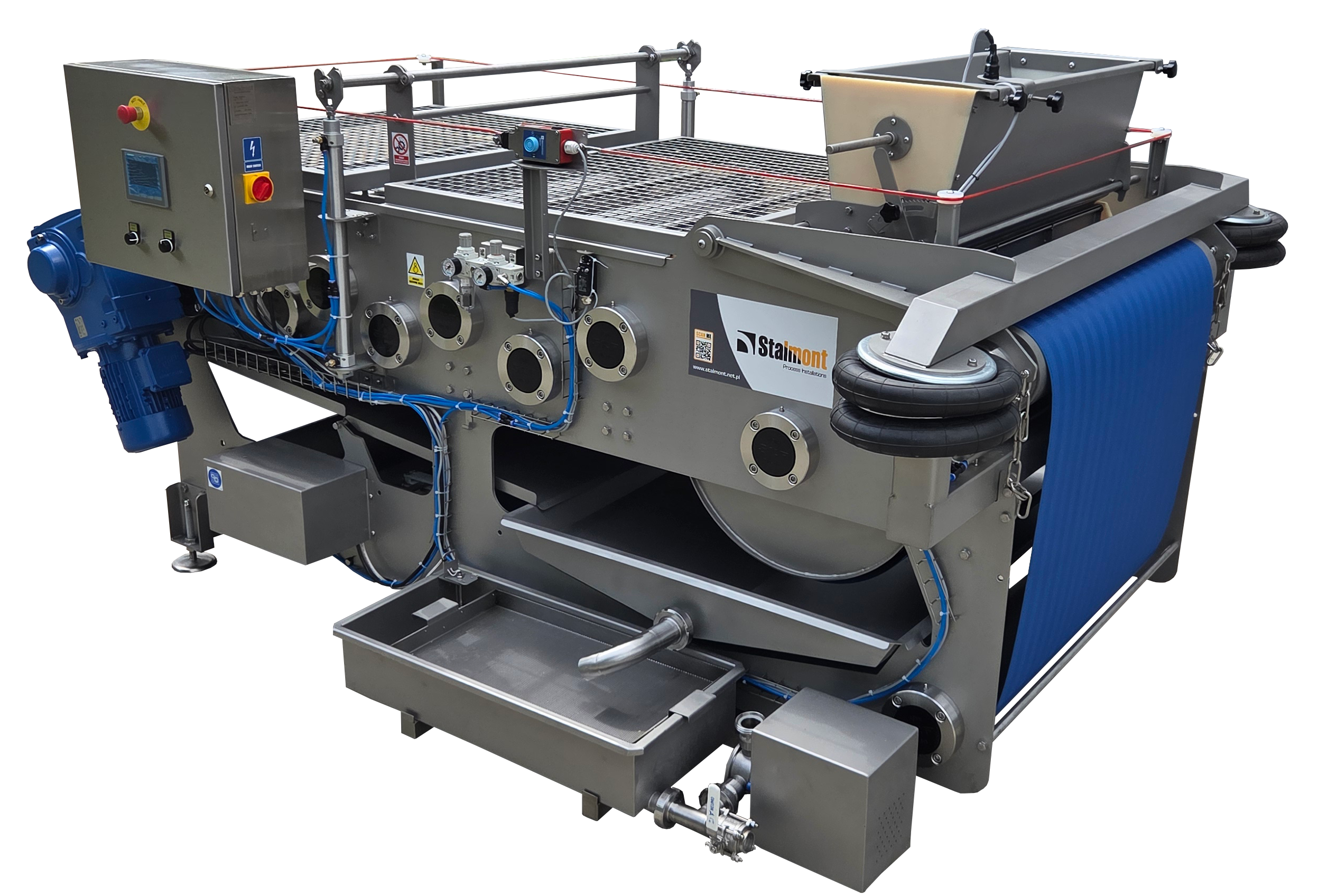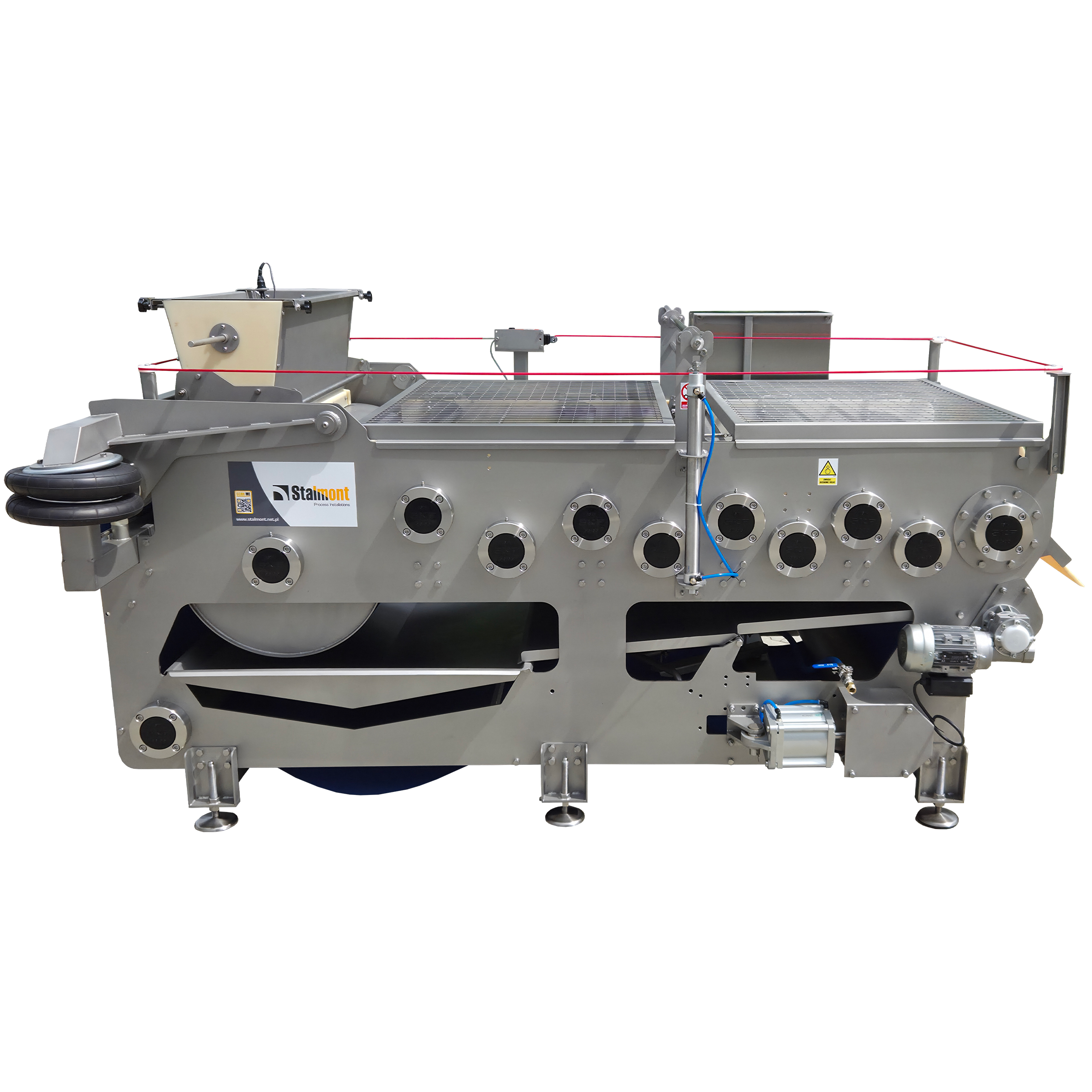 Rozdrobnione owoce są zgniatane pomiędzy taśmą polipropylenową, która przechodzi przez specjalne walce prasujące owoce. Po pierwszym wyciśnięciu prasowany materiał trafia poprzez wałem zwrotny do następnego (mniejszego) wałka prasy i ponownie poddawany jest prasowaniu. Taśma jest automatycznie naprężana poprzez siłowniki pneumatyczne.